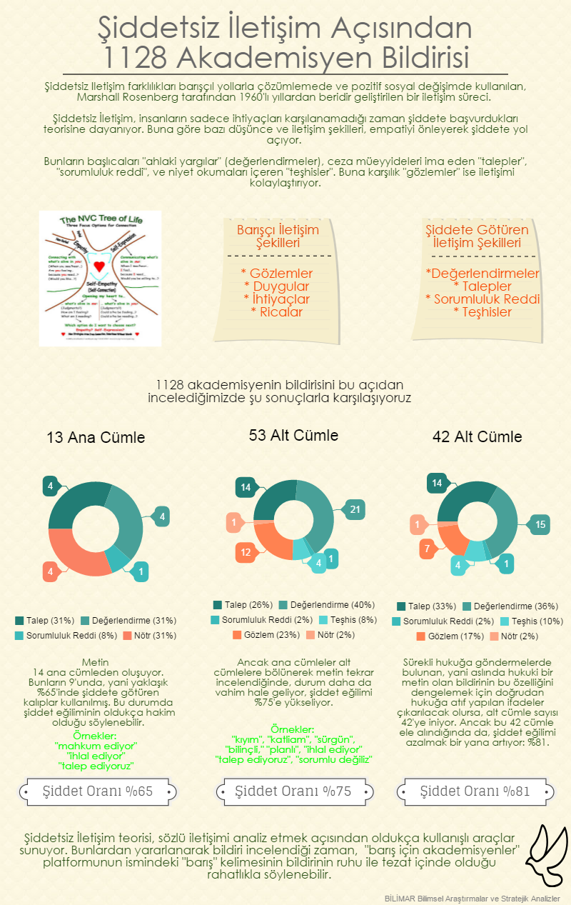 Bu tür bir metinde şiddetsiz iletişimin kullanılamayacağı, durumun zaten çok kötü olduğu ve şiddetin her gün yaşandığı vs. söylenebilir. Ancak şiddetsiz iletişim zaten aslında bu durumlar için geliştirilmiştir ve sağduyu da bize bunun böyle olduğunu söylemektedir. Bu bilindiği halde, “barış” adı altında toplanan akademisyenlerin böyle bir bildiriyi kaleme almaları ve imzalamaları, bildirinin başlığıyla çelişki arz etmektedir.