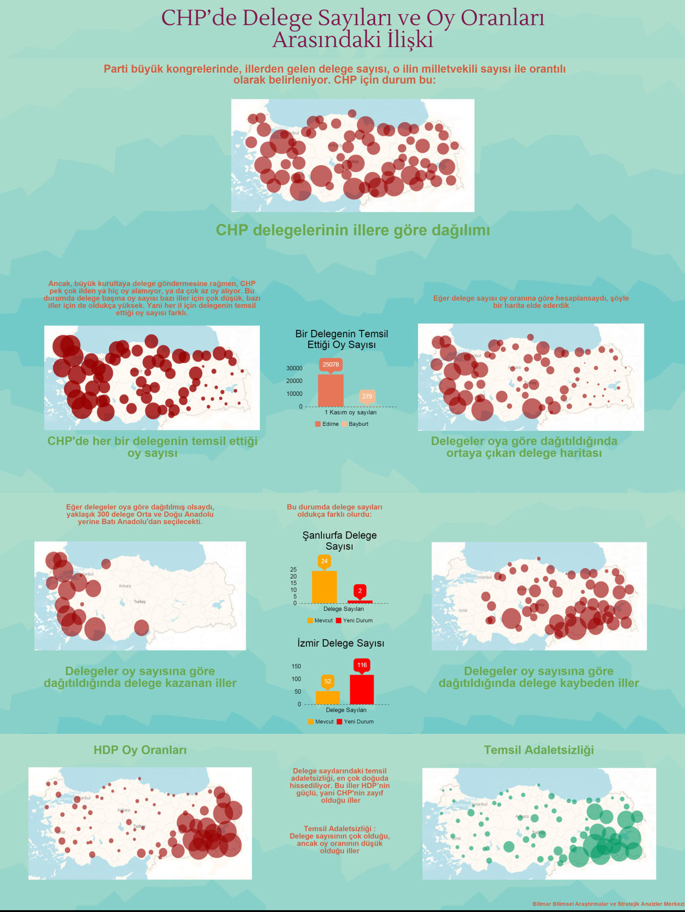 Nitekim CHP’nin gittikçe bölgesel bir partiye dönüşmüş olması, temsil açısından adaletsizliği arttırıyor. Örneğin, CHP’nin 1 Kasım seçimlerine 150.000 oy aldığı Edirne, 6 delege ile temsil ediliyor. Oysa sadece 2.454 oy aldığı Bingöl de 6 delege ile temsil ediliyor. Bu durumda Bingöl delegesi 409 oyu temsil ederken, Edirne delegesi 25.078 oyu temsil ediyor. Ancak her ikisinin de parti kongresindeki oyu bir.